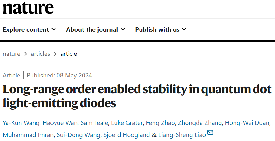 Soochow University Liao Liangsheng (Fang Sheng Optoelectronic CTO) Latest Nature: Long-range Order MKs Quantum Dot Light Emitting Diodes Stable